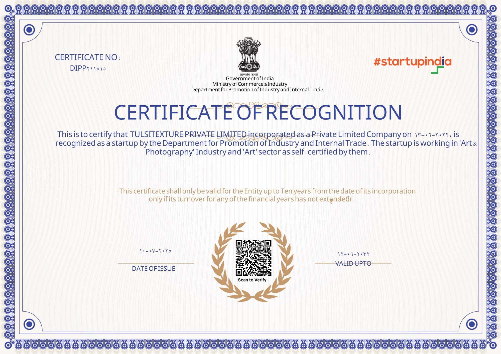 We are proud to be officially recognized as a startup by the Department for Promotion of Industry and Internal Trade (DPIIT) under the Government of India. This recognition is a meaningful milestone that validates our contribution to India's growing art and craft industry and our ongoing commitment to creativity, quality, and innovation in 'Empowering Women to Create Freely'.